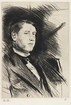 "Heseltine was a keen collector of oil paintings, drawings and watercolours of the English and Continental schools. Among the old master drawings were specimens by Rembrandt, Rubens, Raphael, Michelangelo, Fra Bartolomeo, Holbein, Dürer, Constable, Watteau and Boucher."[1] In 1912, after fifty years of collecting, he sold his collection of over 600 old master drawings to the London dealer Colnaghi & Obach for a price near $1,000,000.[9] Thirty-two of his Rembrandt drawings sold the following May at what was then a high average of over $3,750 per drawing.[10] In his collection, Heseltine also amassed a substantial collection of etchings by the Norwich School of painters.[11]