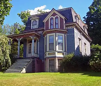 A single round-arched dormer window on the east of the roof is complemented by a gabled dormer with double window next to that itself tops two stories of oriel windows. Next to it, the main entrance is framed by a porch which wraps around the eastern side of the house. It is fronted with a balustrade of scroll sawn panels, and a set of stairs drops to the ground in front of the double-doored entrance.[1]