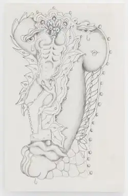 Schacht's early black-and-white drawings, executed in both simple outline or complex, delicate pencil, mix abstract and representational imagery in a stream-of-conscious style.[22][9][24] They are structured by a wide set of symbols (e.g., stars, eyes, trees, breasts, penises, vaginas), which serve as a personal shorthand to explore the human collective unconscious, gender dichotomies, and sexuality.[12][2][7][25] In 1975, Indianapolis Museum of Art curator Lynn Karn published a limited edition of 300 spiral-bound books of Schacht's line drawings, titled Gods in Search of a Myth, which debuted in an exhibit at the Washington Gallery in Frankfort, Indiana.[26][27] She conceived the book with Schacht as a collaborative coloring book whose communication viewer/purchasers would complete when they colored in the images.[28][11][29] Reviews have described Schacht's drawings as intimate, cartoon-like abstractions of flowing, organic forms and sexual symbols that convey "the contemporary primal self" in a raw style.[1][22][9]
