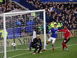Stones was sent off in Everton's 4–1 away win at Young Boys in the last 32 of the UEFA Europa League on 19 February 2015, for conceding a penalty kick with a foul on Guillaume Hoarau, who went on to miss the spot-kick.[21] He scored his first goal for Everton in a 3–0 home win against Manchester United on 26 April 2015, heading in the team's second goal of the game.[22] In July and August 2015, Stones was reportedly the subject of three bids from Chelsea – of £20 million, £26 million and £30 million – all of which were rejected by Everton.[23][24][25] Stones was reported to have handed in a request to leave Everton, but this was also refused.[26]