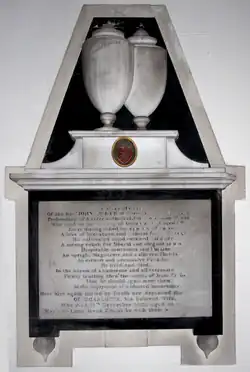 He died on 25 October 1821 at the age of 69 and was buried in Kenton Church, in the chapel at the east end of the north aisle, where survives his mural monument inscribed as follows: