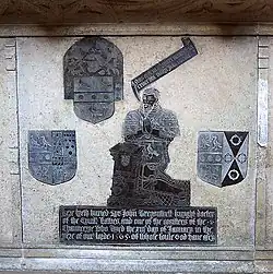 Detail of tomb, showing heraldry (right of picture) for marriage to Newce of Oxford, and (left) for marriage to Kelloway of Rockbourne.