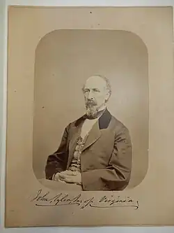 John Tyler III was born on April 27, 1819, to John Tyler and Letitia Tyler. He was a member of the Tyler family. He had fourteen siblings: Mary, Robert, Letitia, Elizabeth, Anne, Alice, Tazewell, David, John Alexander, Julia, Lachlan, Lyon, Robert Fitzwalter and Margaret Pearl.[2] His mother was from a wealthy planter family[3] who owned Cedar Grove plantation.[4] His father was U.S. representative for Virginia's 23rd district congressional district[5] from a wealthy slave-owning Virginia family, descended from the First Families of Virginia.[6]