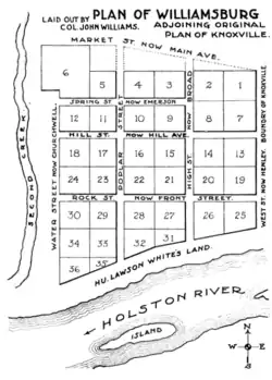 In 1816, Williams made plans to develop a subdivision, "Williamsburg," on what was then the outskirts of Knoxville (now part of the Downtown area). This subdivision was bounded by what is now Henley Street (which at the time was the city's western boundary), Main Street, the riverfront, and Second Creek.[4] The area is now occupied by Maplehurst Park and the Church Street Methodist Church.