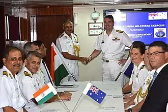 Mead (standing, right) shaking hands with Rear Admiral Ajendra Bahadur Singh during exercise AUSINDEX-15 in September 2015.