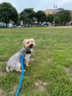 A dog enjoying Jonquil Park. The park's baseball field can be seen in the back right of the image.