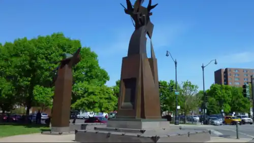The northeast corner of the park features three sculptures created in 1989 by Chicago native Richard Hunt, collectively entitled Eagle Columns.[2] Hunt attended the School of the Art Institute of Chicago, and later lived and worked in a studio across the street from Jonquil Park before creating the sculptures.[5] The bronze sculptures feature three abstract eagles rising from various height pylons, and a plaque memorializes two prominent Illinois citizens: Illinois governor John Peter Altgeld and poet Vachel Lindsay.[13]