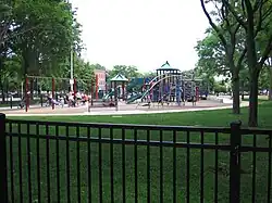 • Playground: The park has an enclosed playground area with modern equipment suitable for children of different age groups, including handicap accessible swings, climbing structures, and a triple shower water sprayer turned on during the summer months.[7] The playground was updated in 2009 and 2023.[8]