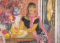 In 1941, Roosenburg-Goudriaan travelled to Eijsden in South Limburg, on the border between the Netherlands and Belgium. There, an art colony had developed at the Oost Castle under her boyfriend, Teun Roosenburg, who was seeking a means of continuing to work without registering with the Nazi-established Nederlandsche Kultuurkamer (Chamber of Dutch Culture).[8][9] She quickly began decorating the castle, creating several murals – including a copy of a Picasso still life.[3] The two were married in 1943. During the war, the couple sheltered numerous artists and musicians.[10] In 1957, the couple bought the castle, restoring it thereafter.[8] They had three children: Joost, Albert, and Olivier. The latter two became artists.[6]
