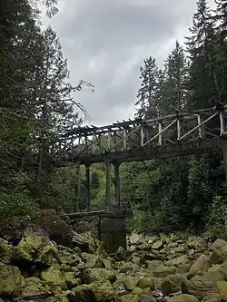 The Vancouver Island Power Company, a subsidiary of British Columbia Electric Railway, completed construction of the smaller Bear Creek Dam and the main Jordan River Diversion Dam in 1911. At 126 feet (38.4 metres) from top to bottom, the Diversion Dam was upon its construction, the highest dam in Canada.[2] Water flowed through a 31,600 ft long flume to the penstock above the power house.[3]: 92 The construction of the dam, due to its remoteness, required the construction of a three-foot narrow gauge railway as well as a cable-railway for the initial ascent from Jordan River.[3] From 1912 to 1931, continual improvements and additional generators pushed the capacity of the power house to 26 megawatts.[4]