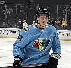 Spence skating in warm-ups on the Los Angeles Kings pride night for the 2021–22 season.
