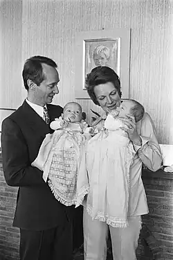 In 1947 Zubiaur married María Josefa Carreño Cima (1918–2015).[19] The couple settled in Pamplona[20] though they used to spend much time in Leitza;[21] they had 7 children, the first one born in 1948. Their marriage endured 65 years; when passing away, Zubiaur had 23 grandchildren.[22] Two of Zubiaur's sons became public figures. The oldest one, José Ángel Zubiaur Carreño, held high administrative and economic offices in the Navarrese self-government and represented Navarre in various central EU bodies;[23] a longtime UPN politician, he left the party in 2013[24] and assumed more right-wing positions.[25] Francisco Javier Zubiaur Carreño held high jobs related to Navarrese culture and is professor in history of art, author of books related to painting, film and museology;[26] politically he tends to a more progressist stand.[27] Among other notable relatives,[28] Zubiaur's paternal uncle Román Zubiaur Salazar was a fairly popular comic actor, in the early 1920s known as a Basque stage character "Martinchú Perugorría".[29]