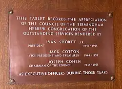 He served as secretary of the Jewish Literary and Debating Society, and of the Birmingham Jewish Athletic Club.[10] He held "almost every executive position" during 40 years with the Birmingham Hebrew Congregation, and was credited with being responsible for the stained glass windows at the city's main synagogue, Singers Hill,[11] where he was chairman of the council from 1944 to 1954.[12] The Joseph Cohen Hall, adjacent to the synagogue, is named in his honour, and the synagogue has several plaques honouring his contributions. He also sat on the board of the University of Birmingham,[10] and was a Freemason of high rank.[1]