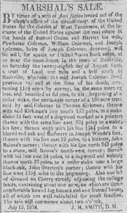 Joseph Coleman's property apparently abutted that of John Overton ("Marshal's Sale" National Banner and Nashville Whig, July 12, 1824)