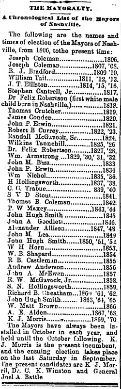6. ^ "Nashville Memories". Nashville Banner. December 6, 1884. p. 2. Retrieved 2024-09-04. Public Domain This article incorporates text from this source, which is in the public domain.