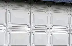 Buildings constructed according to the Danly system featured a wrought iron structure, with cast iron connecting pieces and thin, galvanized and embossed iron cladding panels. The panels had edges folded at 90 degrees with holes for the bolts, and featured convex geometrical designs serving both decorative and structural functions.[1] The wrought iron structural frame, introduced with the 1887 improvement patent, allowed for the erection of elaborate and complex buildings, often two stories tall; smaller, single-story buildings featured a relatively lighter frame, made of small vertical T-beams.[8]