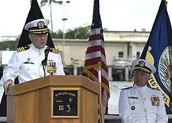 Capt. Joe E. Tofalo makes his final remarks as commanding officer of Submarine Squadron 3