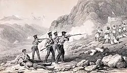 Heroic conduct of four privates, of H.M. 31st Regiment, at the Battle of Mazeena. Artist: Henry Martens