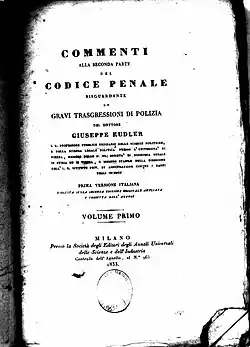 • Commenti alla seconda parte del codice penale risguardante le gravi trasgressioni di polizia (in Italian). Vol. 1. Milano: Societa degli editori degli annali universali delle scienze e dell'industria. 1833.