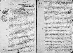 In 1754, Juan Miguel de Esparza was legal representative of several creditors of Francisco de Escalada (merchant), among which was Patrick Lynch, a famous Irish merchant established in Buenos Aires.[13] He was also in charge of the legal defense of people without economic resources, including a black man named Felix, who had exercised the office of executioner of the city of Buenos Aires.[14]