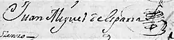Juan Miguel de Esparza was baptized on January 30, 1712, in the Cathedral of Buenos Aires by the presbyter Bernardino Verdún, being his godparents Miguel de Riglos and Josefa Rosa Alvarado. He was married to his cousin María Eugenia Sánchez, daughter of Francisco Sánchez and Sebastiana Zenarro, a noble lady belonging to the Third Order of Saint Francis.[19] He and his wife were the parents of numerous children, including Mariano Marcos Esparza, godson of Francisco Álvarez Campana, and María Ana de Esparza, goddaughter of Francisco de Cabrera and Antonia Saavedra.[20]