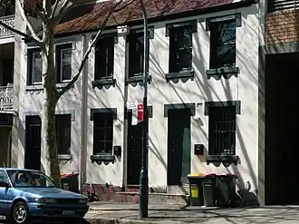 Among the late nineteenth and early twentieth century owners of the terraces was the winemaker, Isaac Himmelhoch, who owned the terraces between 1893 and 1913. Himmelhoch was a businessman who owned a large amount of inner city property. Thomas Playfair, who owned the terraces between 1916 and 1925, was a member of a Sydney butchery and meat provedore family, who had served with distinction in World War I. In 1927 he became a member of the New South Wales Legislative Council and was influential in the establishment of the United Australia Party. In 1926 Playfair sold the five terraces to Anna Hindmarsh who retained ownership until 1958.[1]