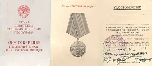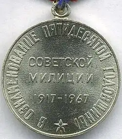 The Jubilee Medal "50 Years of the Soviet Militia" (Russian: Юбилейная медаль «50 лет советской милиции») was a state commemorative medal of the Soviet Union established by decree of the Presidium of the Supreme Soviet of the USSR on November 20, 1967[1] to commemorate the fiftieth anniversary of the creation of the Soviet Militia, it was mainly awarded to deserving members of the state police. Its statute was amended on July 18, 1980 by decree of the Presidium of the Supreme Soviet.[2]