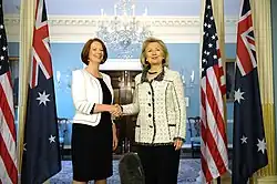 In her role as Minister for Education, Gillard travelled to Washington, D.C., in 2009, where she signed a deal with US Secretary of Education Arne Duncan to encourage improved policy collaboration in education reform between both countries.[52] The establishment of the Australian Curriculum, Assessment and Reporting Authority (ACARA), an independent authority responsible for the development of a national curriculum, was amongst her first policy pursuits in 2008.[53] She launched the government's "Digital Education Revolution" (DER) program, which provided laptops to all public secondary school students and developed quality digital tools, resources and infrastructure for all schools.[54] In conjunction with DER, Gillard oversaw the "Building the Education Revolution" (BER) program, which allocated $16 billion to build new school accommodation including classrooms, libraries and assembly halls.[55][56]