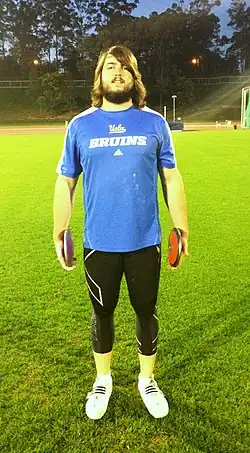 Wruck's most successful year came in 2013, where in the US College Division 1 system he claimed John Godina’s UCLA and Pac-12 Records, and Hannes Hopley’s all time NCAA record. A big highlight was "...his performance at the exhibition Claremont Throws meet the week prior, where he uncorked the best throw ever by a collegian with a 223-7 (68.16m) mark, and won his second NCAA discus title. He finished the season not only undefeated but nearly untouchable in eight collegiate events in 2013, registering the top 27 throws by any collegian in 2013."[8] Finally, after being nominated for the Bowerman Award for the best male Track and Field Athlete of the Year in the US Collegiate system, Wruck was selected as a finalist (final 3) and was voted number one in the Bowerman Fan Vote.[9]