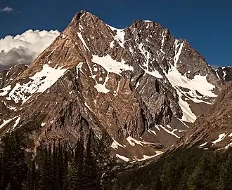 ![]() Karnak-Jumbo Massif, southwest aspect. Karnak (left), Jumbo (right) | |
