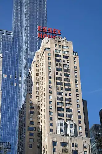 The JW Marriott Essex House (commonly known as the Essex House) is a luxury hotel at 160 Central Park South in Midtown Manhattan, New York City, at the southern border of Central Park. Opened in 1931, the hotel is 44 stories tall and contains 426 Art Deco–style rooms and 101 suites, as well as 147 condominium residences.[2] It features a distinctive red neon rooftop sign.