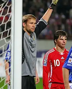 At the start of the FIFA World Cup qualification, Jääskeläinen helped Finland earn four points after drawing against Germany and Azerbaijan.[270] In a match against Wales on 28 March 2009, he started the whole game and kept a clean sheet, in a 2–0 win.[271] After the match, Jääskeläinen said he was happy with the performance and called it "one of the best games he played in the national team."[272] However, Finland failed to qualify for the FIFA World Cup after finishing third in the qualifying campaign.[273] On 29 October 2009, Jääskeläinen announced his retirement from international football having collected 55 caps for his country. In explaining his decision Jääskeläinen stated that he hoped that it would allow him to prolong his club career.[274] However, on 6 October 2010 Jääskeläinen announced his comeback to national team in a match against Hungary as Otto Fredrikson was unable to play because of an injury but confirmed that this was just a one-off.[275][190]