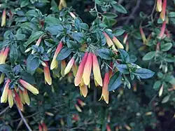 It is a dwarf, rounded evergreen shrub growing to 30–60 cm (12–24 in) tall and wide, with downy stems and leaves, and spikes of nodding, tubular flowers of yellow shading to scarlet at the base. Each pair of leaves has one leaf smaller than the other. It requires a frost-free environment, so is often grown under glass in temperate regions.[2] Despite its common name Brazilian fuchsia, it is not closely related to the true fuchsias.