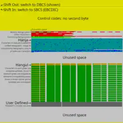 Similarly to its Japanese counterpart JIS C 6220 (JIS X 0201), N-byte Hangul code could be used as a 7-bit encoding, with character allocations over the range 0x40 through 0x7C.[5] The chart below shows the code in an 8-bit environment with the high bit set (i.e. over 0xC0 through 0xFC), as it is used in e.g. code page 891 or 1040.