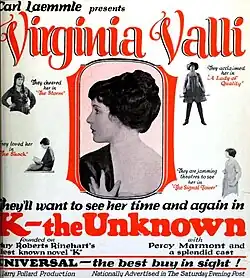 K – The Unknown is a 1924 American silent mystery film directed by Harry A. Pollard and starring Virginia Valli, Percy Marmont, and Margarita Fischer.[1] It is based on the 1915 novel K. by Mary Roberts Rinehart.[2]