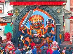 Kaal Bhairav is a Hindu shrine located in Kathmandu Durbar Square, a UNESCO World Heritage Site.[1][2] According to legend, the shrine was found at a paddy field and later it was placed at the Durbar Square by King Pratap Malla.[3] Kaal Bhairav is believed to have been sculptured from a single stone.[4]