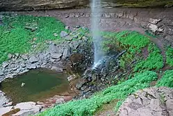 Most of the drop is accounted for by the upper cascade. The shelf dividing the two falls (and creating the large pool between them) is the break between the Manorkill Sandstone formed in the Middle Devonian period and the Oneonta-Genesee sandstone-shale mixture of the late Devonian period.[2]