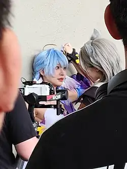 Kabedon or kabe-don (Japanese: 壁ドン; kabe, "wall", and don, "bang") refers to the action of slapping a wall fiercely, which produces a loud sound, "don". One use of this phrase is to describe the action of slapping a wall as a protest in collective housing, such as condominiums, when the neighboring unit makes too much noise.[1] Another use often appears in shōjo manga or anime when one character forces another against the wall with one hand or leans against the wall, making the "don" sound. This has become a popular tool to invoke the "clever move of confession" trope and for creating an intimate atmosphere.[2][3]