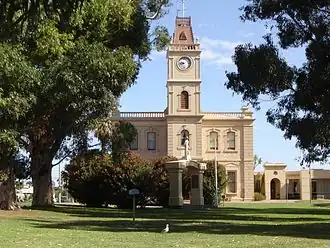 In 1862, the Hundred of Wallaroo and Hundred of Kadina were proclaimed in order to allow parcels of land to be sold in the vicinity of the copper mines. In the same year a horse-drawn railway from Kadina to the port at Wallaroo, west of the town, was opened.[4] Further lines connecting Kadina to Port Wakefield, to the southeast, and Bute, to the northeast (Kadina-Brinkworth railway line), opened in 1878 and 1879, respectively.[5][6]