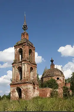 The district contains twenty-eight cultural heritage monuments of federal significance (sixteen of them located in Kalyazin) and additionally forty-two objects classified as cultural and historical heritage of local significance (twenty-two of them in Kalyazin). The district landmark is the Kalyazin Bell Tower, submerged by the Uglich Reservoir and located only partially above the water level. Other federal monuments include the ensemble of administrative buildings and living houses in the center of Kalyazin, the Ascencion and the Epiphany Churches in Kalyazin, the Epiphany Church in the village of Semendyayevo, and the estates of Kalabriyevo and Rylovo, as well as an archeological site.[15]