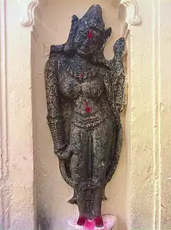 The goddess is worshipped according to both vamachara ("left-hand path") as well as the dakshinachara ("right-hand path") modes of worship.[54] Offerings to the goddess are usually flowers, but might include animal sacrifices. In general female animals are exempt from sacrifice, a rule that is relaxed during mass sacrifices.[55]