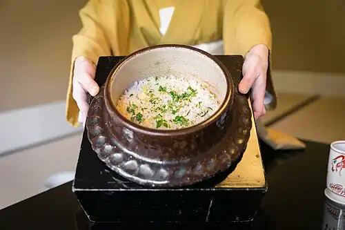 Later, similar to takikomi gohan, kamameshi came to refer to a type of Japanese pilaf cooked with various types of meat, seafood, and vegetables and flavored with soy sauce, sake, or mirin.[2][3] By cooking the rice and various ingredients in an iron pot, the rice gets slightly burned at the bottom which adds a desirable flavor to the rice. Kama designed specifically to prepare kamameshi appeared on the market as the dish became popular across Japan, and the prepared kamameshi is placed directly on the table in its pot for the meal.[1]