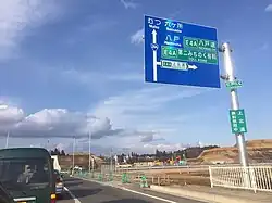 The Kamikita Expressway was designated in 1987 as part of a single expressway running from the capital city of Aomori Prefecture, Aomori to the prefecture's second largest city, Hachinohe.[6] The first section of the expressway opened in 2013, two years ahead of schedule. This section connects the Daini-Michinoku Toll Road to Aomori Prefecture Route 211. On 27 November 2018, National Route 394 was rerouted as part of the expressway project to improve access at the junction between it and the expressway.[7] On 8 February 2019, the interchanges that were set to open later that year were renamed from Kamikita 2 Interchange and Tenmabayashi 1 to Tōhoku Interchange and Shichinohe Interchange, respectively.[3] The section between Route 211 and National Route 394 was opened on 16 March 2019 at 4:00 p.m. JST after festivities and a tape cutting ceremony.[8][9] The expressway was extended an additional 8.3 kilometers (5.2 mi) between National Route 394 and National Route 4 on 27 November 2022.[10]
