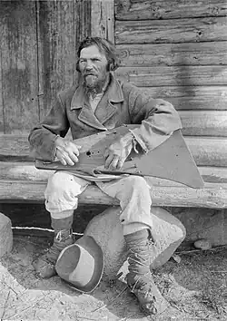 According to Finnish linguist Eino Nieminen, the name of the instrument, along with the names of most of its neighbouring counterparts (Finnish kantele, Livonian kāndla, Latvian kokles and Lithuanian kanklės), possibly comes from the Proto-Baltic form *kantlīs/*kantlēs, which originally meant 'the singing tree',[2] ultimately deriving from the Proto-European root *kan- ('to sing, to sound'). However, Lithuanian ethnologist Romualdas Apanavičius believes kokles could be derived from the Proto-European root *gan(dh)-, meaning 'a vessel; a haft (of a sword)', suggesting that it may be related to the Russian word gusli.[3]