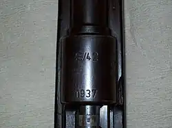 The G40k with a total length of 1,000 mm (39.37 in) and a barrel length of 490 mm (19.29 in) and 3.2 kg (7.1 lb) weight was a shortened experimental version of the Karabiner 98k.[8][24] The rear tangent sight of the G40k was graduated for s.S. Patrone cartridges from 100 m to 1000 m in 100 m increments. A batch of 82 G40k rifles was produced in 1941 at Mauser Oberndorf.[25]