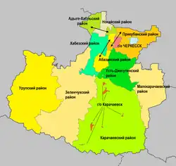 - ^ Russian: Карачаево-Черкесская Республика, romanized: Karachayevo-Cherkesskaya Respublika; Karachay-Balkar: Къарачай-Черкес Республика, romanized: Qaraçay-Çerkes Respublika; Kabardian: Къэрэшей-Шэрджэс Республика, romanized: Ķêrêšei-Šêrdžês Respublikê; Nogai: Карашай-Шеркеш Республика, romanized: Karaşay-Şerkeş Respublika; Abaza: Къарча-Черкес Республика, romanized: Qarça-Çerkes Respublika