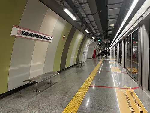 Karadeniz Mahallesi is an underground station on the M7 line of the Istanbul Metro.[1][2] It is located at the Old Edirne Asphalt in the Karadeniz neighbourhood of Gaziosmanpaşa. It was opened on 28 October 2020.[3] Connection is available to the T4 line of the Istanbul Tram.[2]