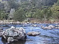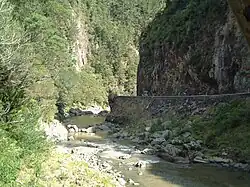 At Karangahake, several walks and tracks ranging from 30 minutes to over 2 hours start at the Karangahake Reserve car park and picnic area.[2] One of the most spectacular walks in the area is the "Windows Walk", a loop walk that leads through the old gold mining tunnels of the Talisman Mine, crosses the Waitawheta River over a suspension bridge, and joins the Crown Tramway Track back along the cliffs of the Waitawheta Gorge.[4][5] The path follows the route of a bush tramway and passes by "windows" in the cliff face at the end of mining tunnels, which were used to tip tailings down into the Waitawheta Gorge. Two of the mining tunnels, which are about 2 metres (7 ft) tall and wide, are safe to enter. They end abruptly after about 50 metres (164 ft) and are home to glowworms and cave weta.