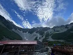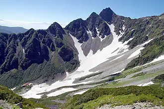 Karasawa Cirque is the center for mountaineering Mount Hotakadake, and is filled with tents in summer. Climbers might also choose to stay at Karasawa Hütte (涸沢ヒュッテ, Karasawa hyutte) or Karasawa Hut (涸沢小屋テ, Karasawa goya). Some snow remains in summer. The cirque is also famous for the vivid colors of its autumn leaves, and is the "best autumn hike in Kamikochi".[4]