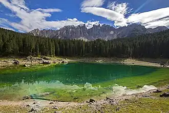 Lake Carezza (Italian: Lago di Carezza; German: Karersee) is a small alpine lake in the Dolomites in South Tyrol, Italy. It is known for its wonderful colors and its view of the Latemar mountain range.